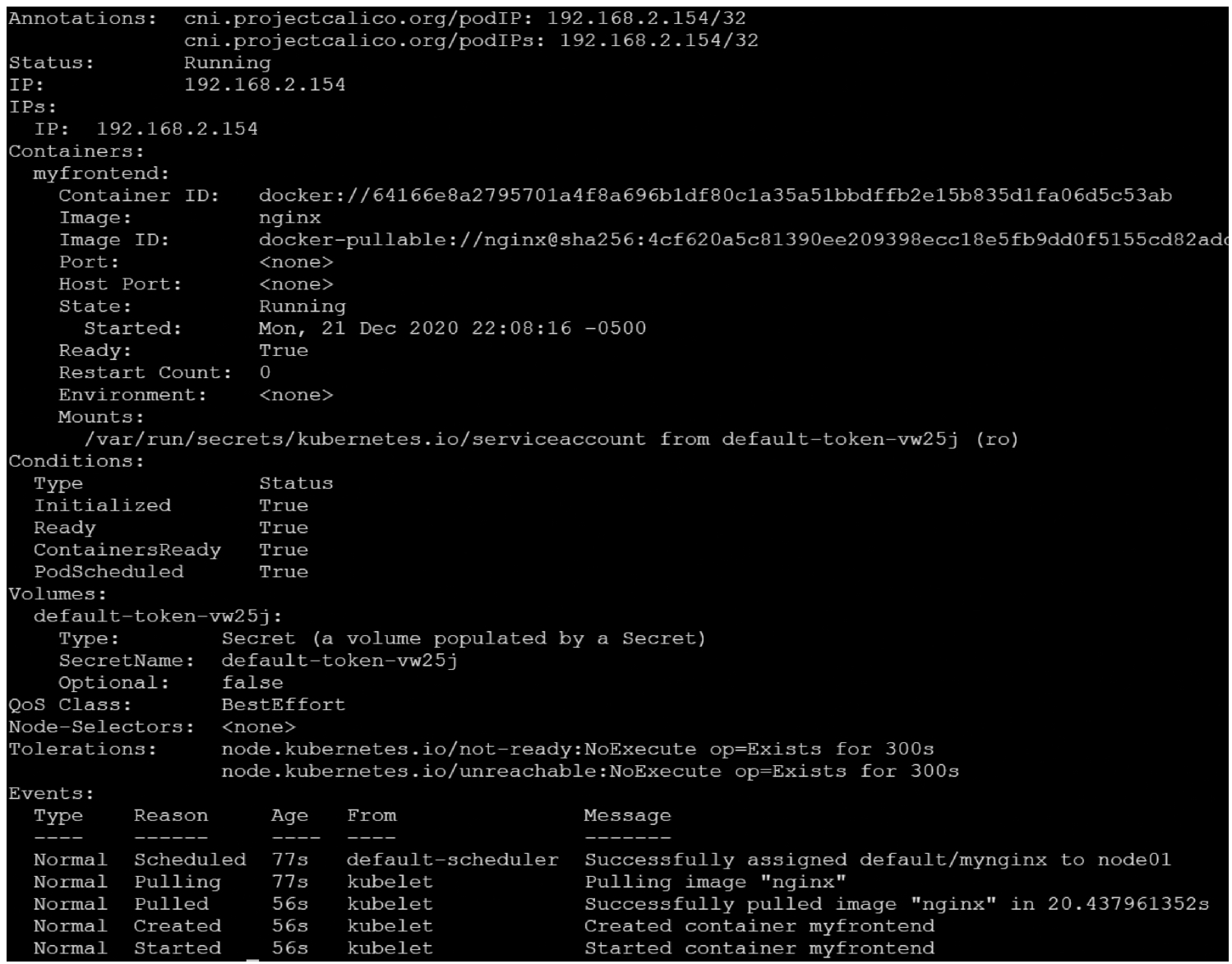 上述命令的部分输出信息如图3-4所示,除了创建Pod时设置的Pod Name为mynginx,容器名字为nginx-container,容器Image为nginx等配置信息外,系统还输出了Pod的状态(Status)是Running,容器的状态(State)是Running等,这些信息都是Pod创建后,由Kubernetes所填入和更新的。