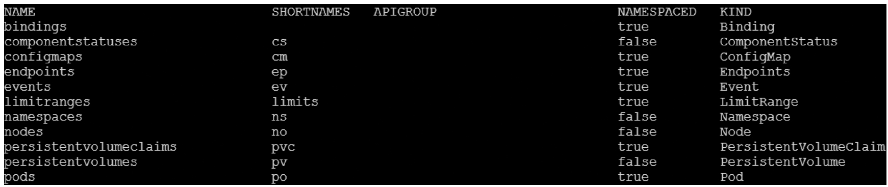 4)第四列表示该resource是否位于Namespace之中,Namespace用来划分Kubernetes,不同的Namespace之间,resource是互相隔离的,因此可以认为Namespace是一个虚拟Kubernetes集群。但并不是所有的resource都在Namespace内,只有NAMESPACED为true的resource才可以划分到一个Namespace中,NAMESPACED为false的resource不属于任何Namespace。