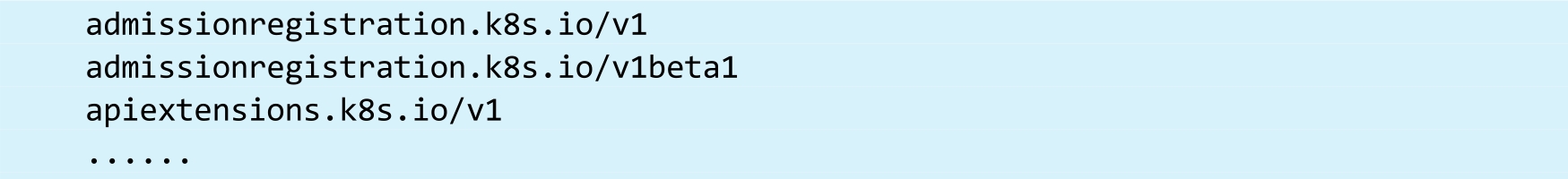 上述命令执行结果如下,都是GROUP/VERSION形式的apiVersion,例如第一行admissionregistration.k8s.io/v1,其中admissionregistration.k8s.io就是GROUP(API group),v1则是VERSION(API version)。