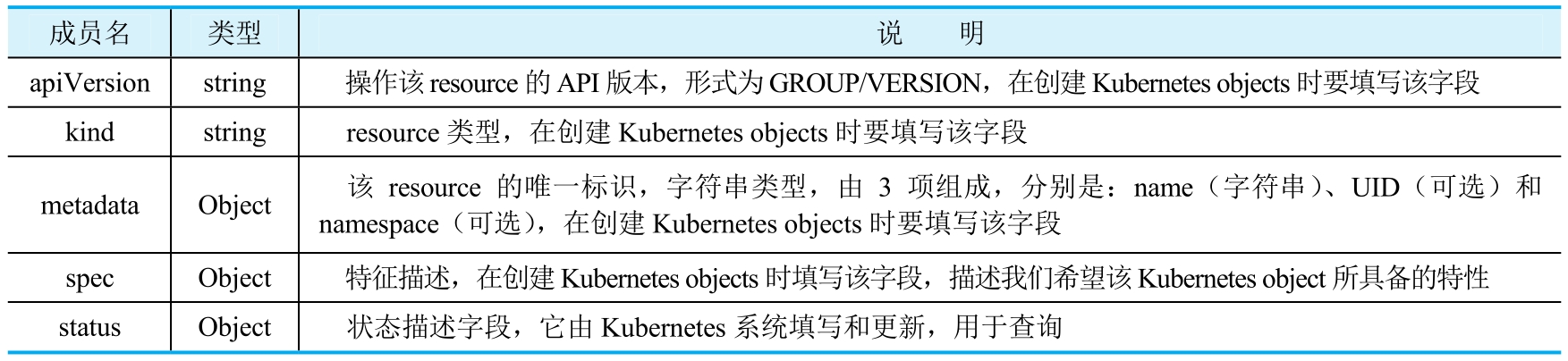 Kubernetes object的公共成员(字段)如表1-1所示,这5个成员是每个Kubernetes object都具有的,其中前4个成员用于创建Kubernetes object时填写,第5个成员status,Kubernetes object创建后由Kubernetes填写和更新,供用户查询。