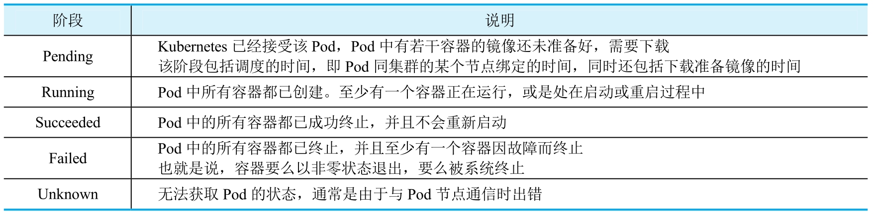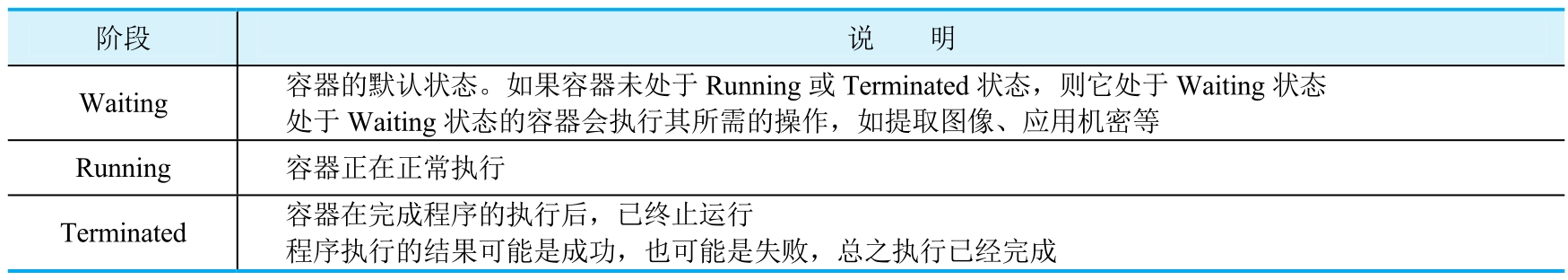 一旦Pod同Kubernetes集群的某个节点绑定后,就会在该节点创建容器,因此容器也有状态,其说明如表1-3所示。