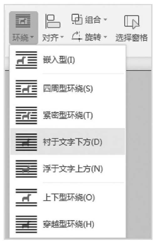 5)单击“环绕”下拉按钮,从下拉列表中选择“衬于文字下方”选项,如图1-8所示。