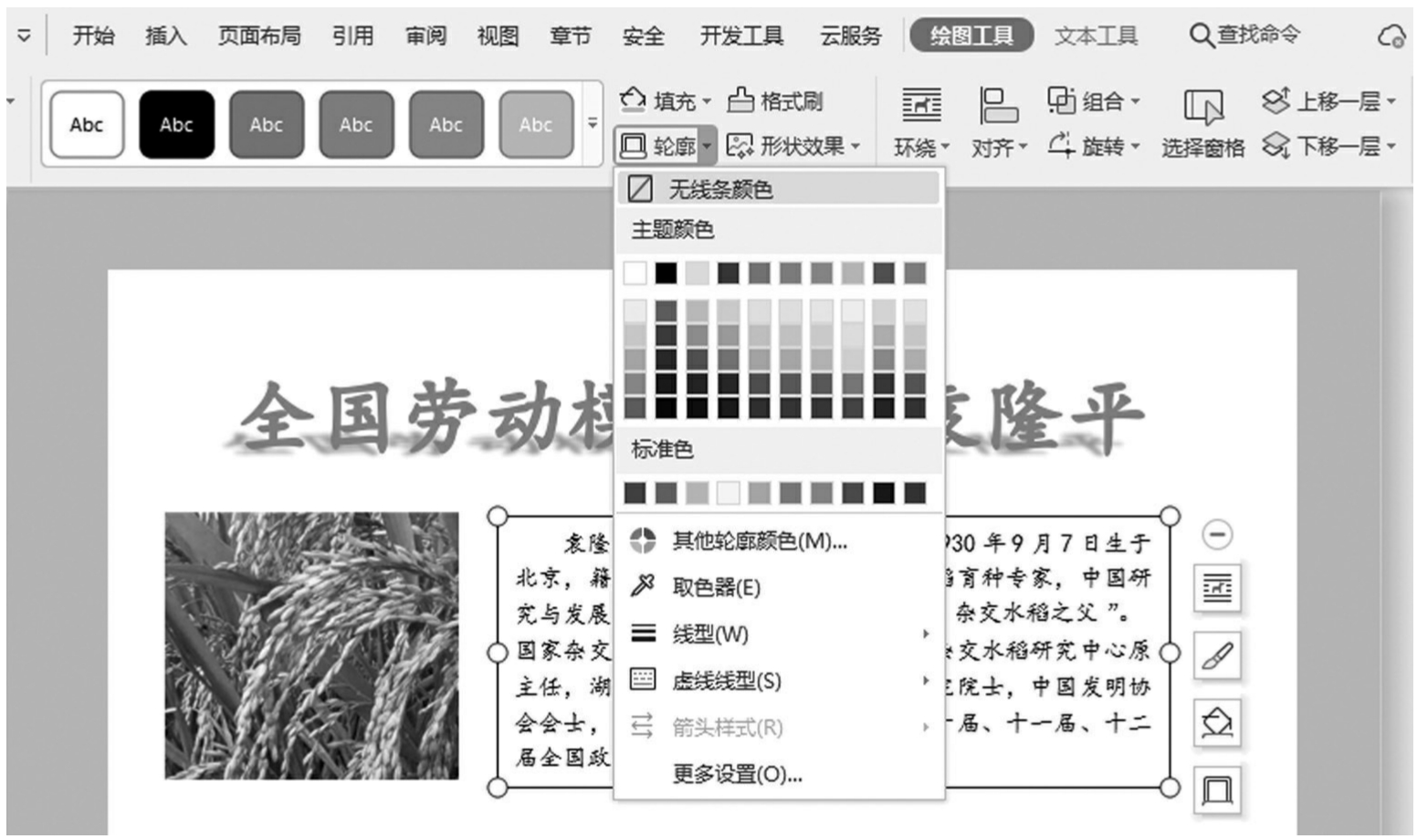 被誉为“杂交水稻之父”的袁隆平,将“发展杂交水稻,造福世界人民”作为终其一生的理想和追求。他长期致力于促进杂交水稻技术创新,并将其推广至全世界。利用自选图形结合文本框可以将水稻研究过程清晰、有条理地展现出来。为了增强整体效果,可以利用形状中的圆角矩形实现此版块的边框效果。操作步骤如下。