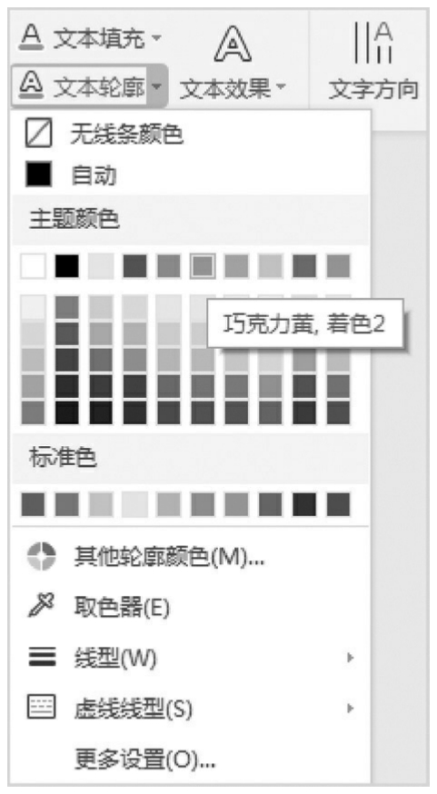 5)单击“文本轮廓”下拉按钮,从下拉列表中选择“主题颜色”栏中的“巧克力黄,着色2”选项,如图1-13所示。