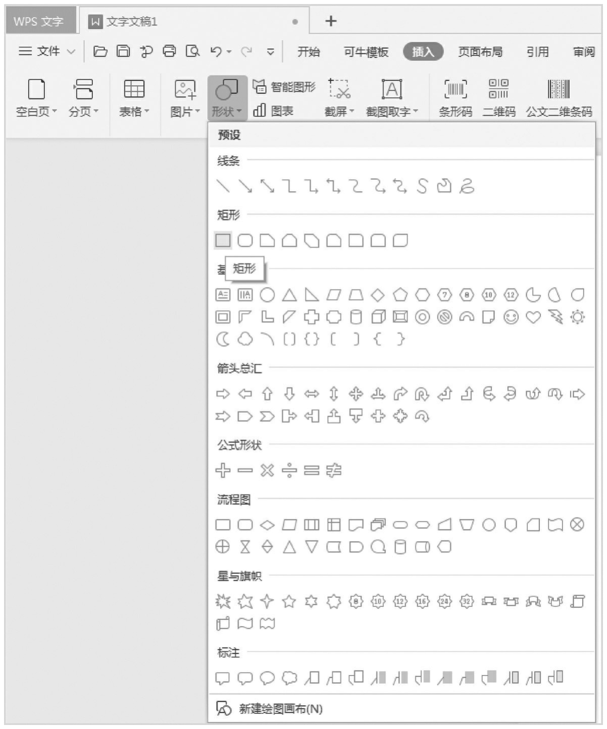1)切换到“插入”选项卡,单击“形状”按钮,在弹出的样式库中选择“矩形”栏中的“矩形”选项,如图1-5所示。