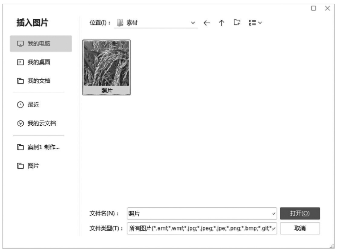 1)切换到“插入”选项卡,单击“图片”按钮,打开“插入图片”对话框,选择素材文件夹中的图片“照片”,如图1-16所示。单击“打开”按钮,完成图片的插入。