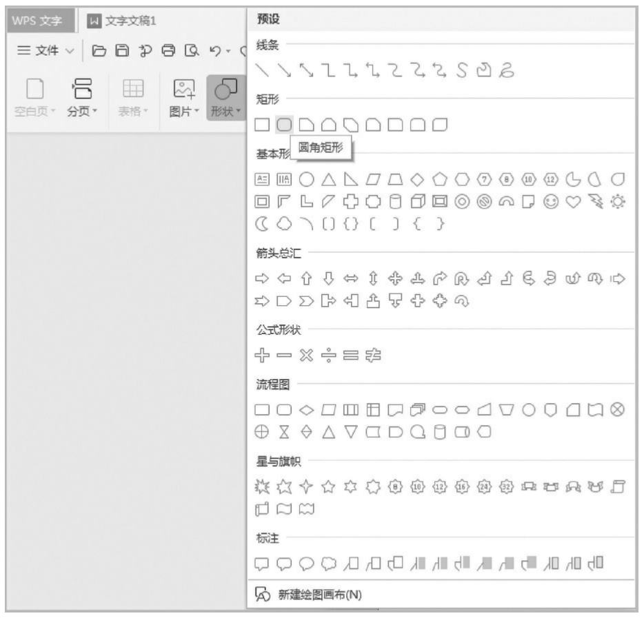 1)切换到“插入”选项卡,单击“形状”按钮,从样式库中选择“矩形”栏中的“圆角矩形”选项,如图1-22所示。将鼠标移到文档中,根据效果图利用鼠标在个人基本情况图片的右下方绘制一个圆角矩形。