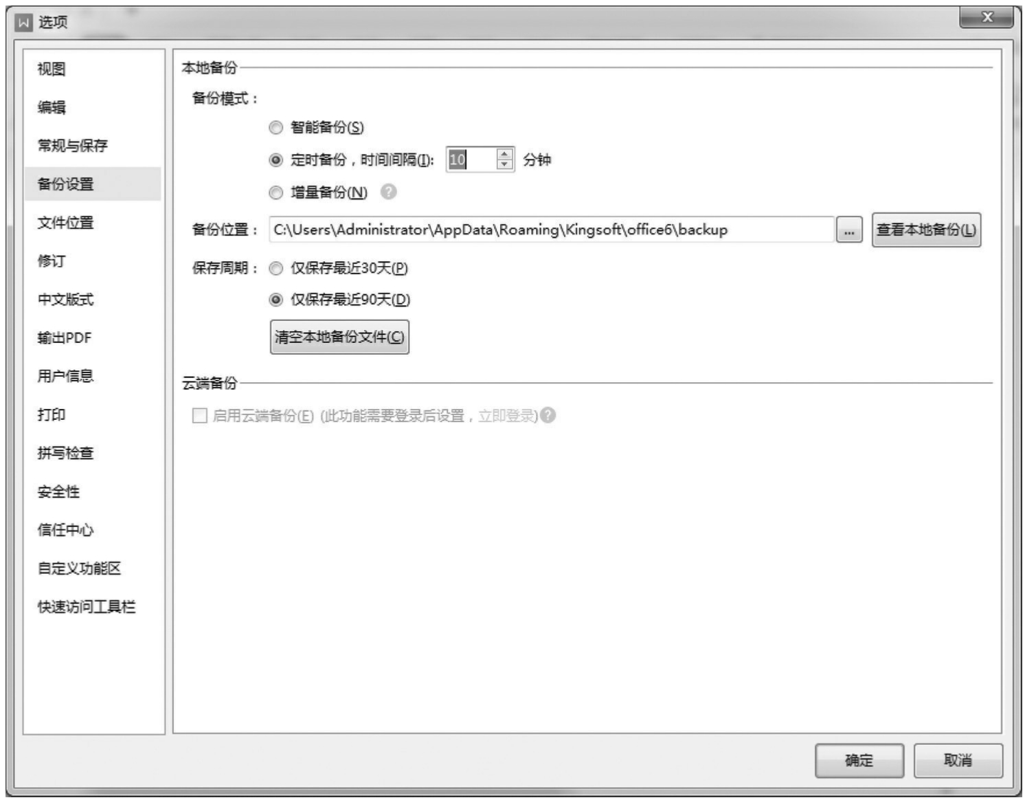 切换到“文件”选项卡,在列表中选择“选项”选项,打开“选项”对话框,选择列表中的“备份设置”,在“备份模式”栏中选择“定时备份,时间间隔”单选按钮,并在后面的微调框中输入自动保存的间隔时间,如图1-34所示。设置完成后,单击“确定”按钮,完成自动保存的设置。
