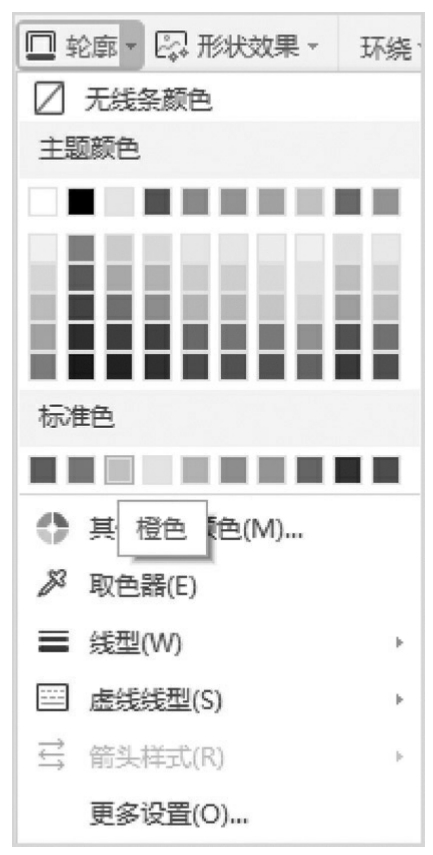 4)单击“轮廓”下拉按钮,从下拉列表中选择“标准色”中的“橙色”选项,如图1-7所示。