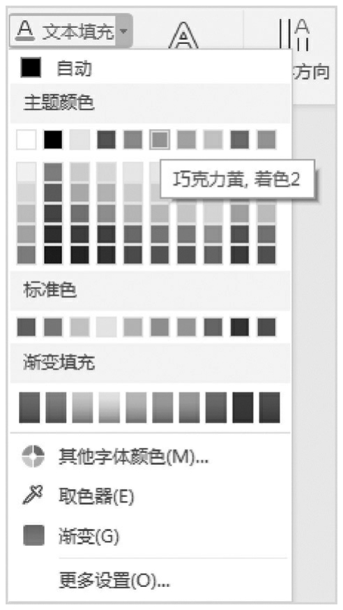 4)单击“文本填充”下拉按钮,从下拉列表中选择“主题颜色”栏中的“巧克力黄,着色2”选项,如图1-12所示。
