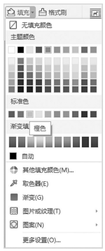 3)选中矩形,切换到“绘图工具”选项卡,单击“填充”下拉按钮,从下拉列表中选择“标准色”中的“橙色”选项,如图1-6所示。