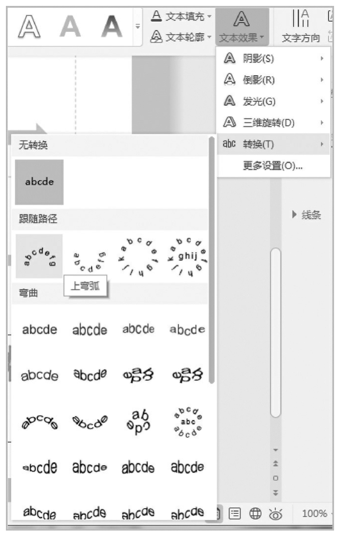 10)使艺术字处于选中的状态,切换到“文本工具”选项卡,单击“文本效果”下拉按钮,从弹出的下拉列表中选择“转换”→“跟随路径”→“上弯弧”选项,如图1-32所示。