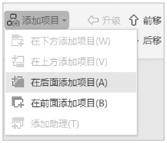 3)选中图形中的一个矩形节点,在“设计”选项卡中单击“添加项目”按钮,从下拉列表中选择“在后面添加项目”选项,如图1-29所示。使当前的智能图形拥有四个矩形节点。