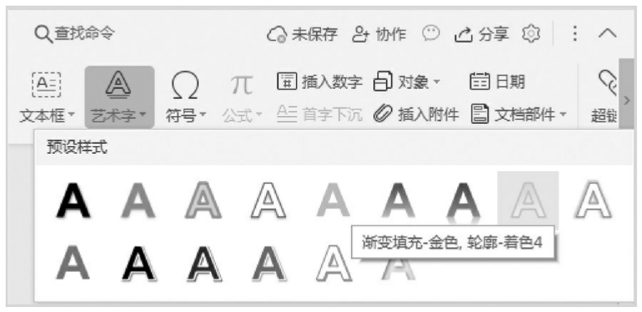 1)切换到“插入”选项卡,单击“艺术字”按钮,从样式库中选择“渐变填充-金色,轮廓-着色4”选项,如图1-10所示。