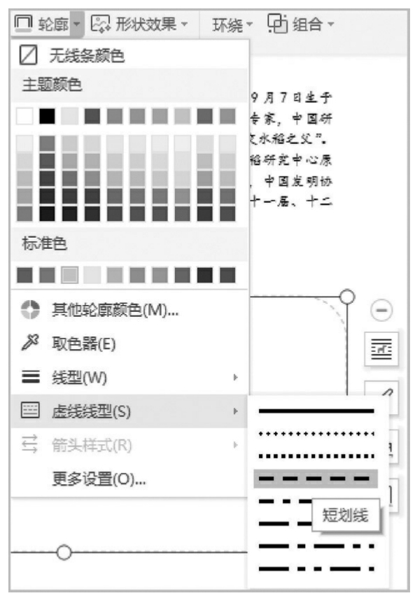 4)利用同样的方法,绘制一个大的圆角矩形,作为此版块的边框。根据效果图调整此圆角矩形的大小和位置。选中大的圆角矩形,切换到“绘图工具”选项卡,设置“填充”为“无填充颜色”,在“轮廓”下拉列表中设置“颜色”为标准色中的“橙色”,选择“虚线线型”→“短划线”选项,如图1-23所示,选择“线型”→“0.5磅”选项。