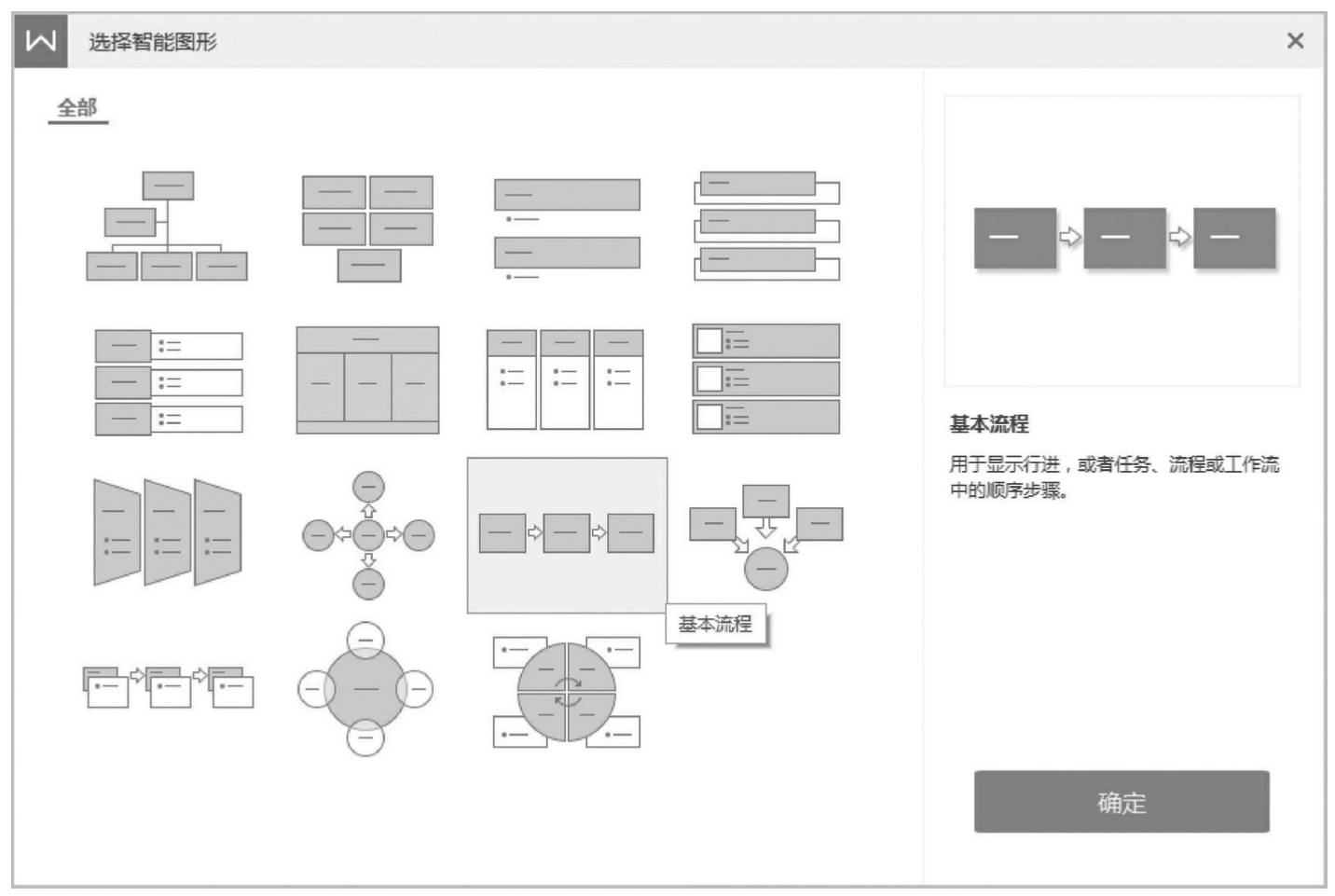 1)切换到“插入”选项卡,单击“智能图形”按钮,打开“选择智能图形”对话框,在对话框的列表中选择“基本流程”选项,如图1-28所示。