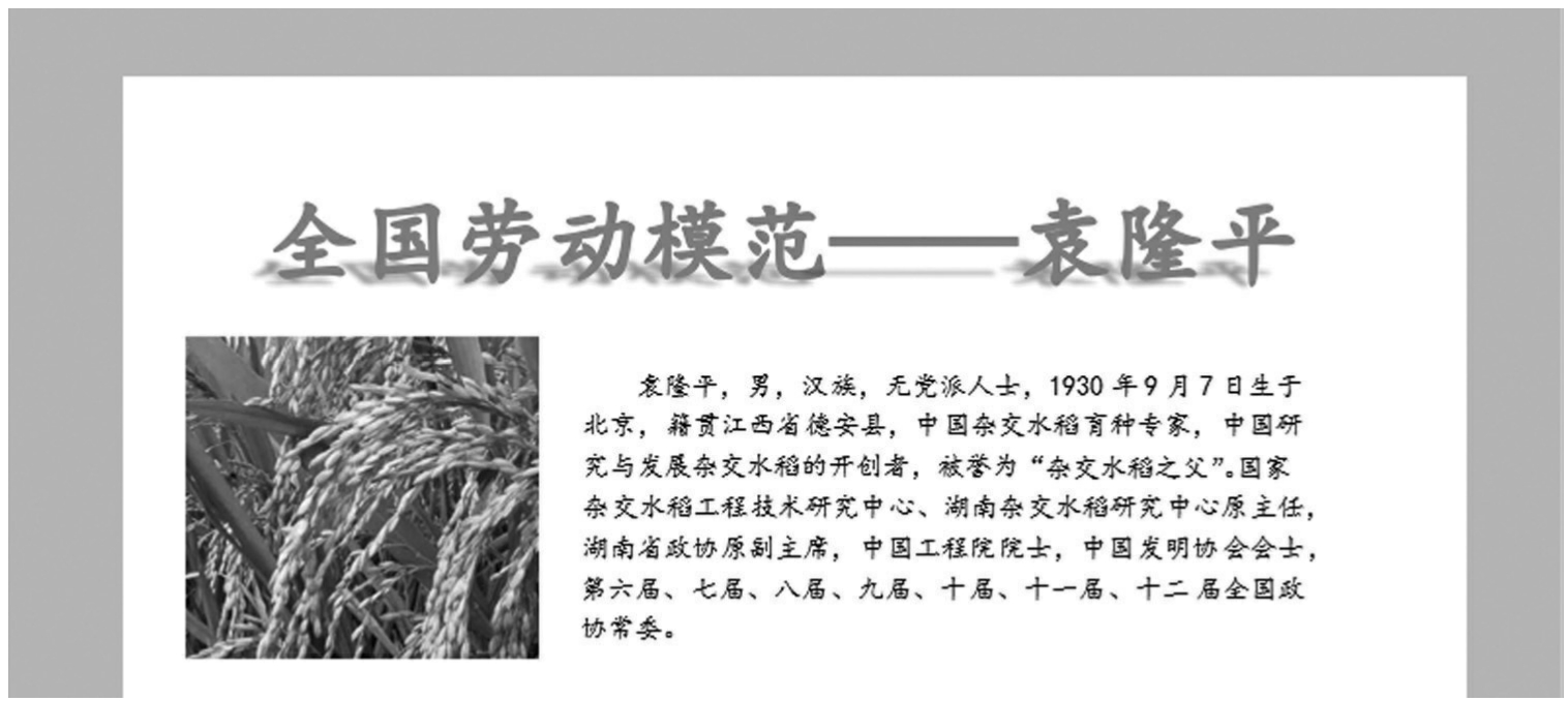 从效果图(图1-1)可以看出,个人简历共分为三个版块,第一个版块为个人基本情况,第二个版块为水稻研究过程,第三个版块为获得的荣誉。在个人基本情况版块中,文档的大标题使用WPS文字中的艺术字实现,标题下方的基本信息由WPS文字中的文本框实现,在基本信息的左侧利用图片进行装饰。