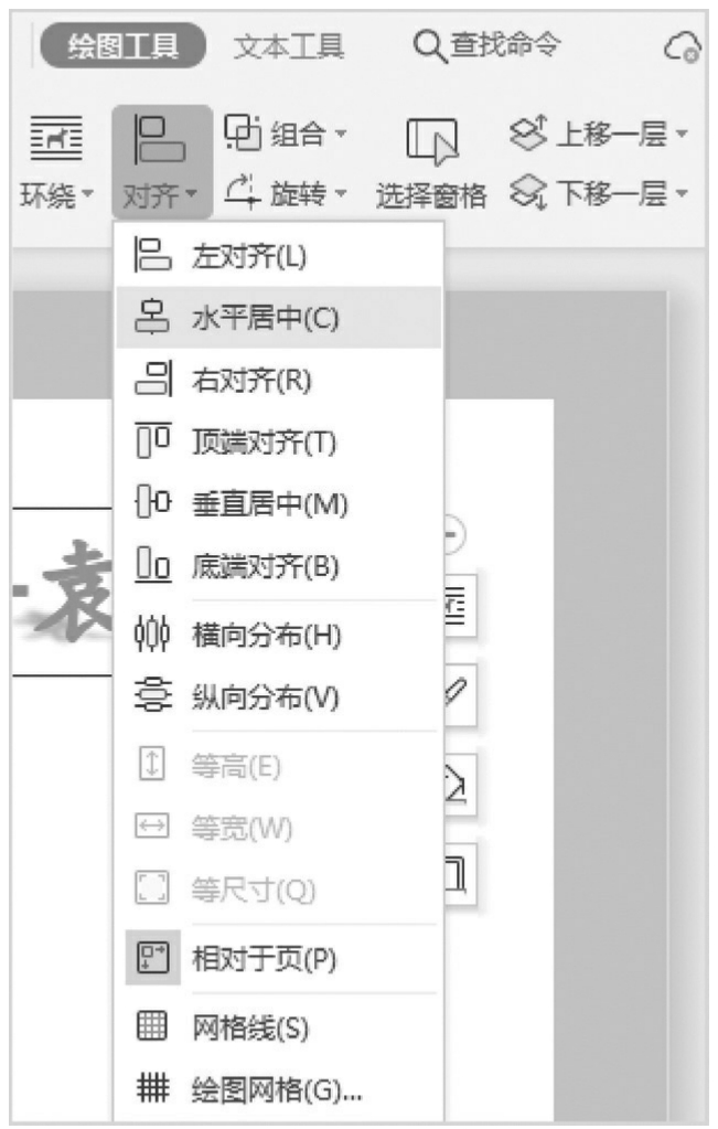 7)切换到“绘图工具”选项卡,单击“对齐”按钮,从下拉列表中选择“水平居中”选项,如图1-15所示。调整艺术字的水平位置,完成艺术字的设置。