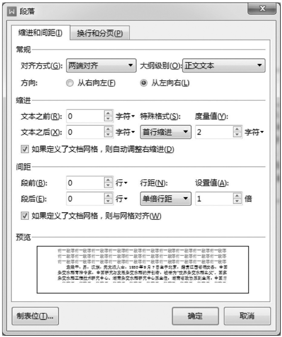 5)单击“段落”按钮,打开“段落”对话框,在“缩进”栏中,单击“特殊格式”下拉按钮,从下拉列表中选择“首行缩进”选项,保持“度量值”微调框的值不变,如图1-19所示。单击“确定”按钮,完成文本的段落格式设置。