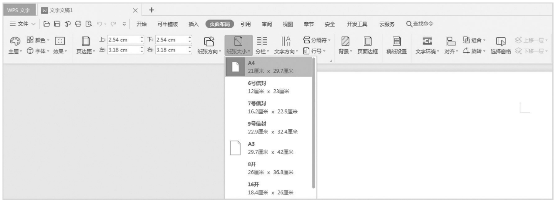 1)切换到“页面布局”选项卡,单击“纸张大小”按钮,在下拉列表中选择“A4”选项,如图1-3所示。