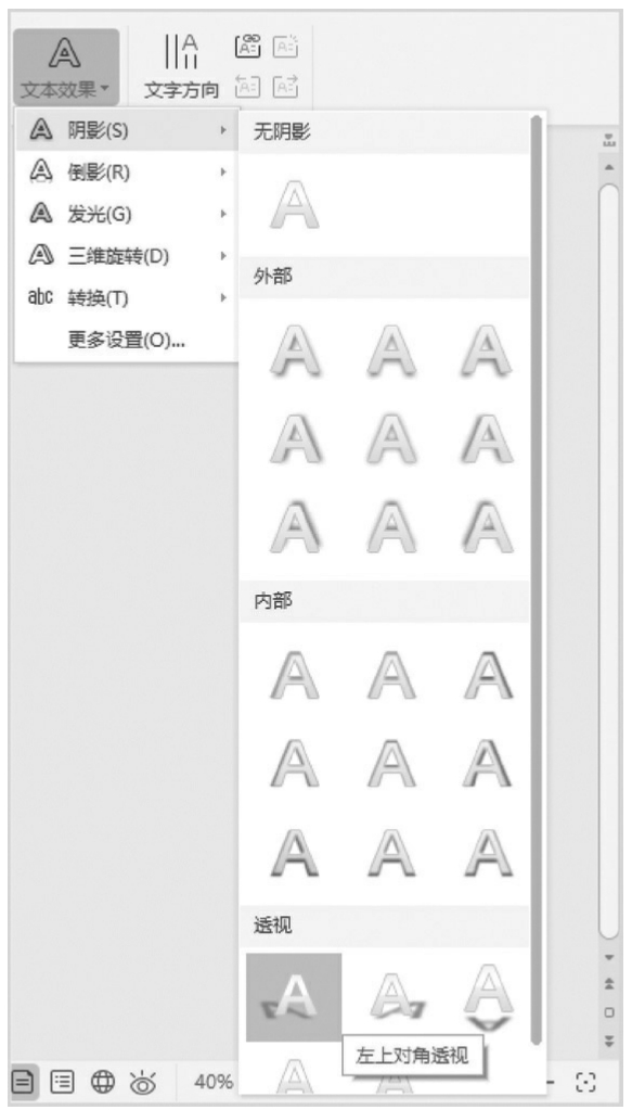 6)单击“文本效果”下拉按钮,从下拉列表中选择“阴影”→“透视”→“左上对角透视”选项,如图1-14所示。