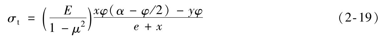 由前述假设可知,子午断面在中性点 O 处沿圆周方向的切向应变为零,故该点的切向应力也为零, O 点以外的点均存在切向应变和切向应力。建立如图2-11所示的坐标系 XOY 则断面上任意点( x , y )的切向应力 σ t (MPa)为