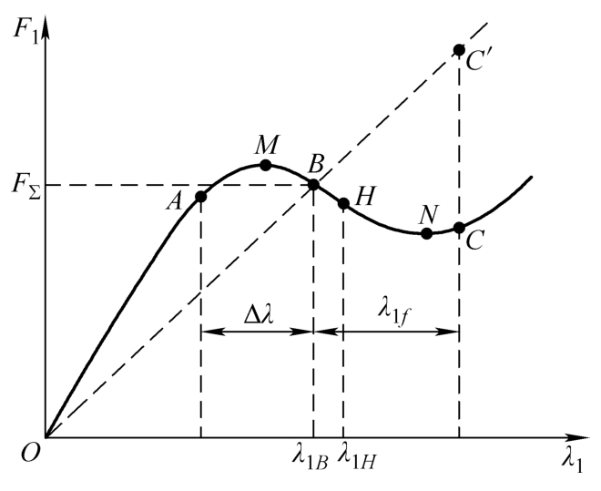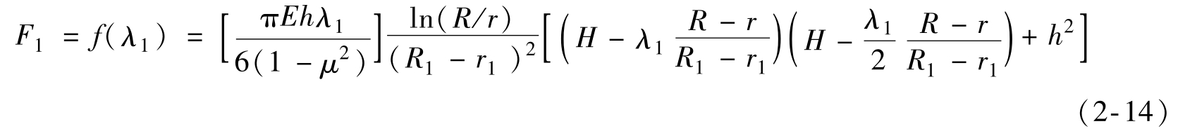 通过支承环和压盘施加在膜片弹簧上的载荷 F 1 (N)集中在支承环处,加载点间的相对轴向变形为 λ 1 (mm)(图2-10b),则膜片弹簧弹性的特性(图2-9)如下式表示:
