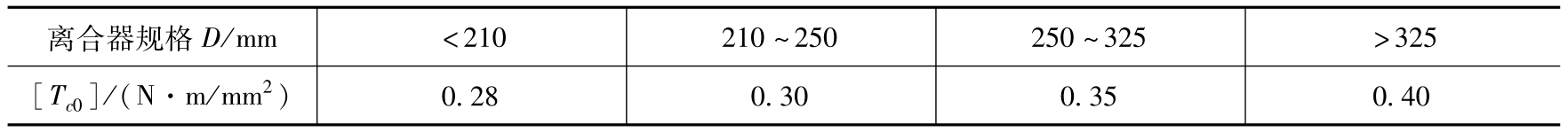 6)为降低离合器滑磨时的热负荷,防止摩擦片损伤,对于各类车型,单位压力 p 0 根据所用的摩擦材料在一定范围内选取,取0.1~0.15MPa,即