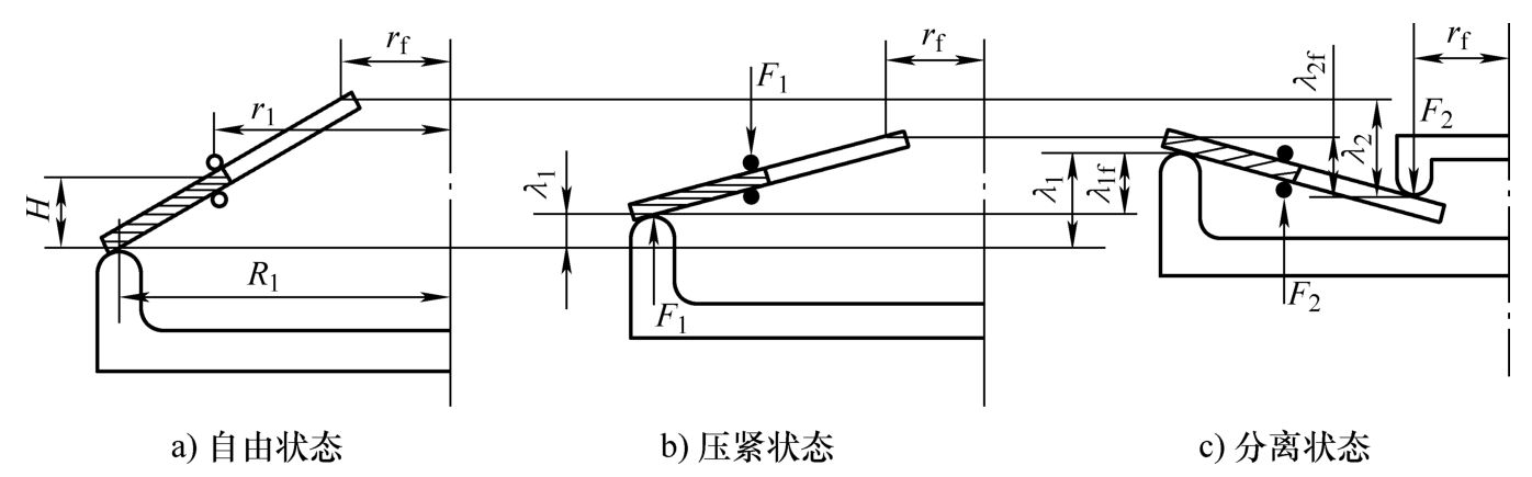 当离合器分离时,膜片弹簧的加载点将发生变化(图2-10c)。设分离轴承对分离指端所加载荷为 F 2 (N),相应作用点变形为 λ 2 (mm);另外,在分离与压紧状态下,只要膜片弹簧变形到相同的位置,其子午断面从自由状态也转过相同的转角,则有如下关系