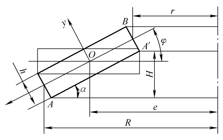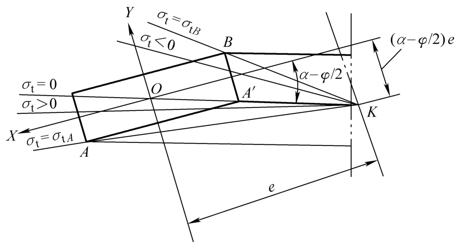 因( α-φ/ 2)很小,( α-φ/ 2)≈tan( α-φ/ 2),则式(2-20)表明:对于一定的 φ ,零应力分布在过 O 点而与 X 轴成( α-φ/ 2)角的直线上(图2-11);实际上,当 x = -e 时,无论 σ t 为何值,均存在 y =-( α-φ/ 2) e ,显然 OK 为零应力直线,其内侧为压应力区,外侧为拉应力区。由此可见碟簧部分上缘 B 点的切向应力最大。当 K 点的纵坐标( α-φ/ 2) e > h/ 2时, A 点的切向拉力最大;当( α-φ/ 2) e < h/ 2时, A '点的切向拉力最大。