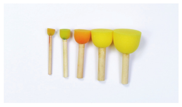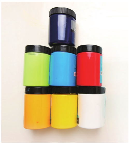 水粉颜料是不透明的水彩颜料。可用于较厚的着色,比较适合涂鸦和厚涂的绘画创作。相较于水彩颜料的轻薄性,水粉颜料很适合作为少儿艺术启蒙的色彩训练。它色彩明快可覆盖,可以附着在大部分的物体表面,因此本书作为重点使用。准备基础常规色即可,也可使用较少的基础色进行调色,在了解色彩调色规律的同时增添了一分乐趣。水粉颜料不常稀释使用,用量较大,建议家长购买罐装或桶装颜料。