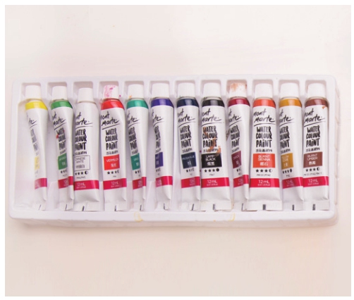 水彩颜料属于水性颜料,所以画水彩画常常选择较为厚重的水彩纸,用来吸掉颜料中多余的水分。因为水彩颜料的稀释性、水溶性和延展性比较好,很适合用于大面积涂色。水彩颜料也很适合作为创意画的媒介,如与油性的蜡笔搭配使用进行创作,或采用撒盐法进行创作。准备基础常规色即可。因水彩颜料使用前需加水稀释,所以建议家长购买小支装的。