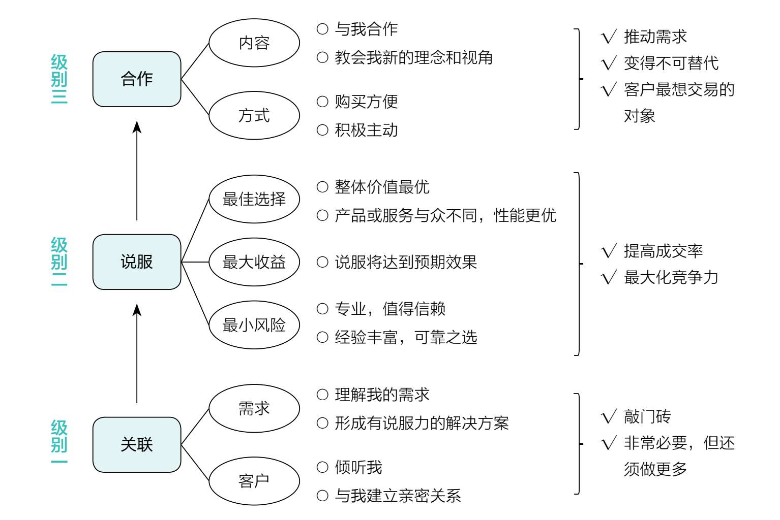 虽然建立关联并与客户建立起良好关系后,销售人员可能还没最终成交,但他们已经登堂入室。如果想要顺利成交,他们还有两个级别的工作需要去做。