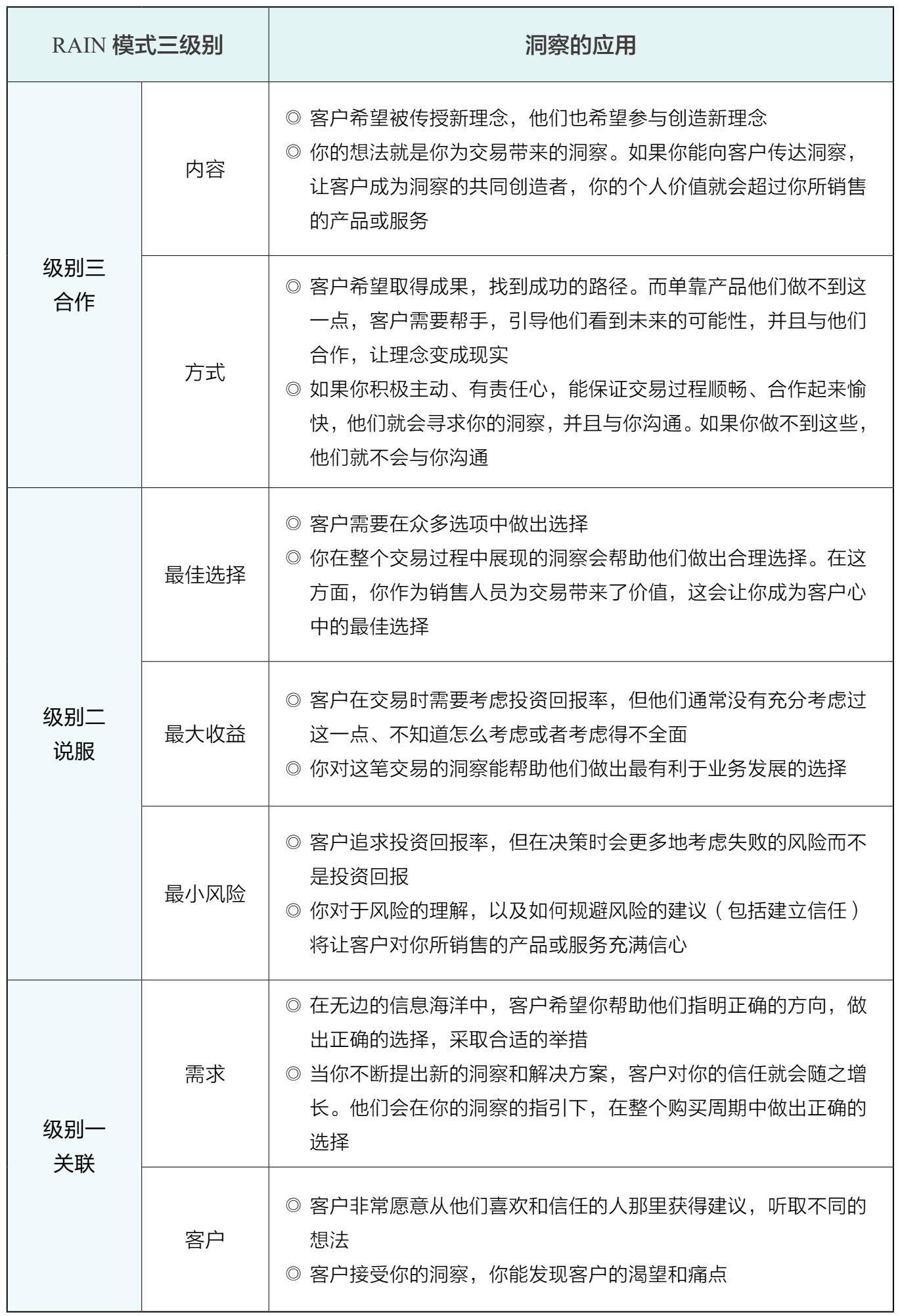 表 1.1 销售人员在RAIN模式三级别中应用洞察