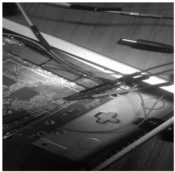 (1)拆解设备外壳,用“飞针”勾住芯片的各个引脚,如图3-71所示。