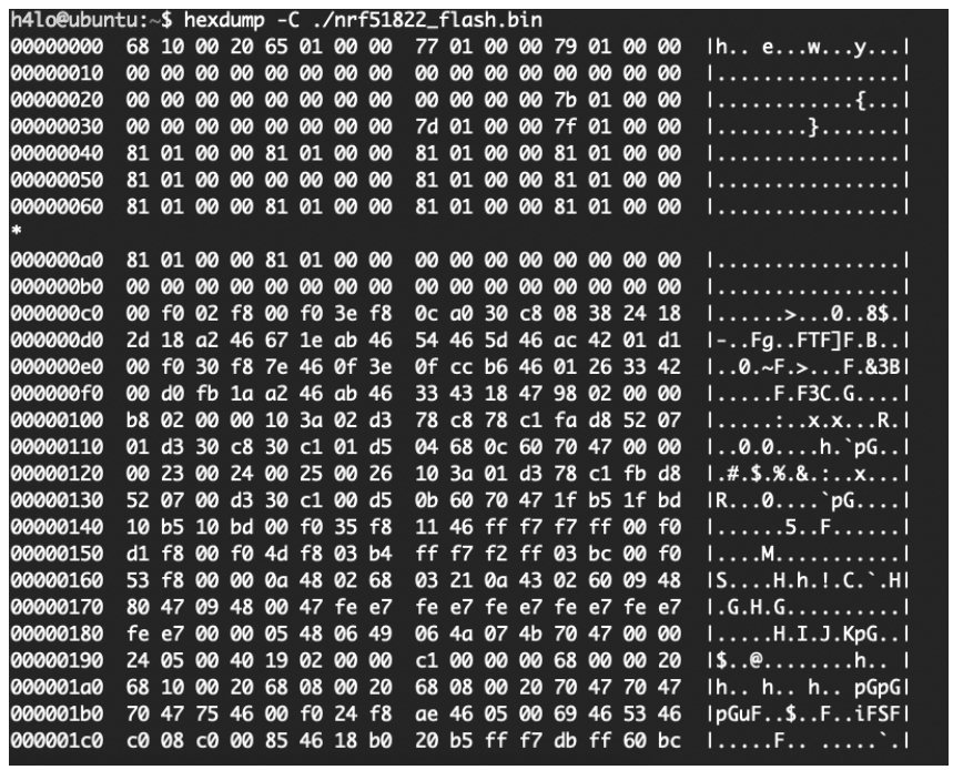 (4)使用dump命令读取内存数据,获取蓝牙设备固件内容。使用hexdump命令查看导出的固件内容,如图3-88所示。
