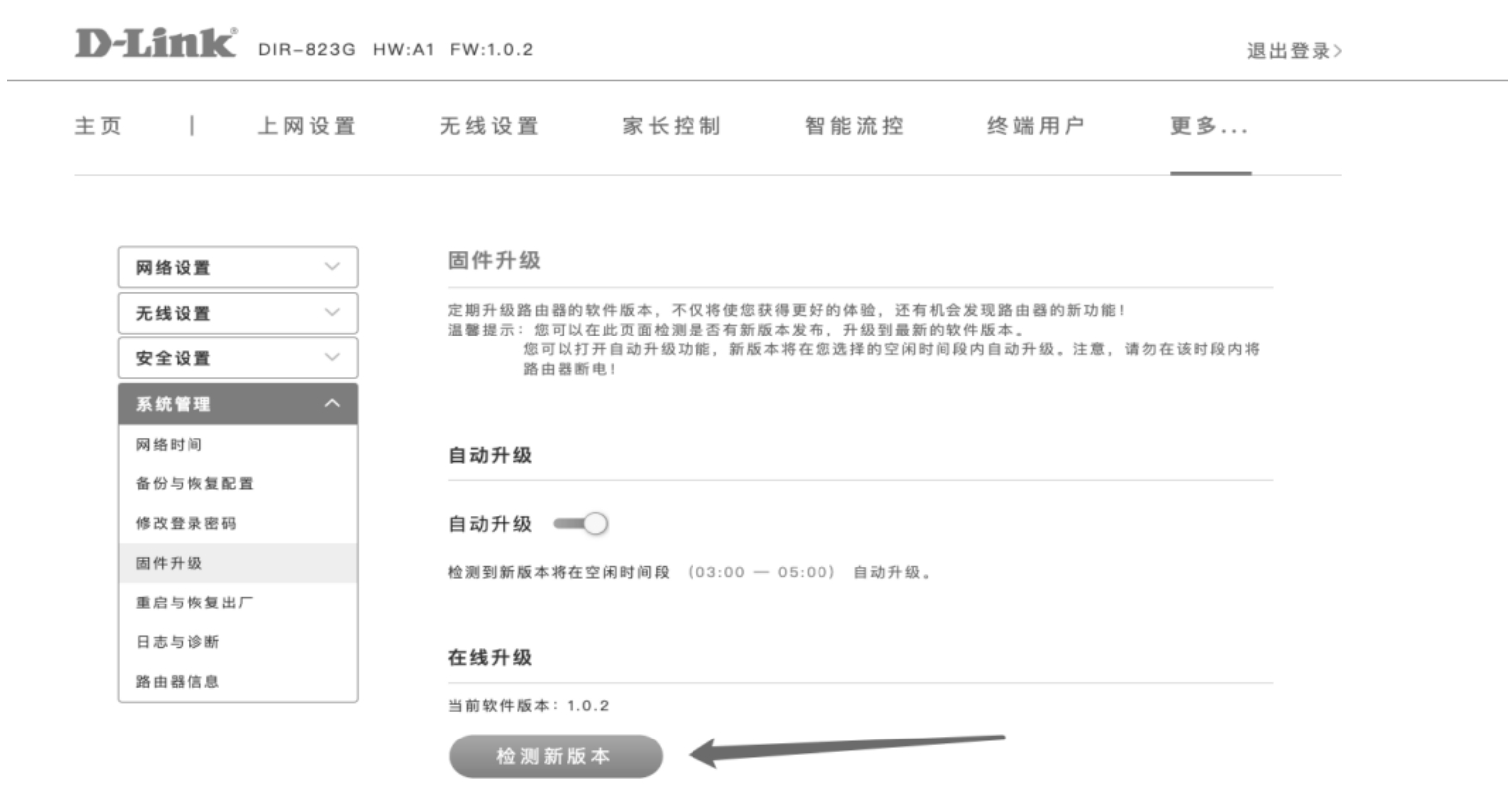 (1)D-Link DIR-823G路由器后台“在线升级”功能。当登录到路由器后台时,选择“更多”→“系统管理”→“固件升级”选项,可以看到“检测新版本”按钮,如图3-54所示。