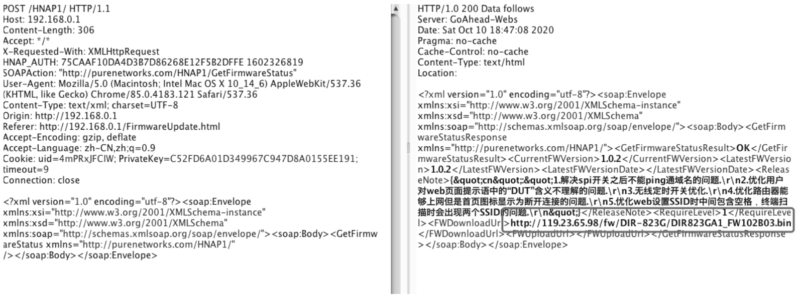 (2)单击“检测新版本”按钮,使用BurpSuite工具的拦截功能进行抓包,此时返回包中直接返回了一个如图3-55所示的固件下载链接。