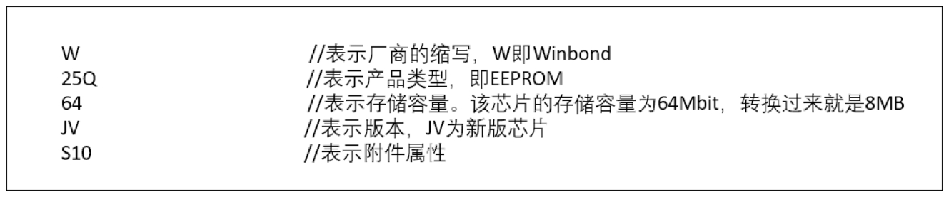 PCB板上的Flash芯片通常印有一段字符串,字符串的字段都有特殊含义,通常带有厂商名和产品型号的相关信息。这里以厂商Winbond的芯片W25Q64JVS10为例进行说明,其名称中各个字段表示的含义如图3-63所示。
