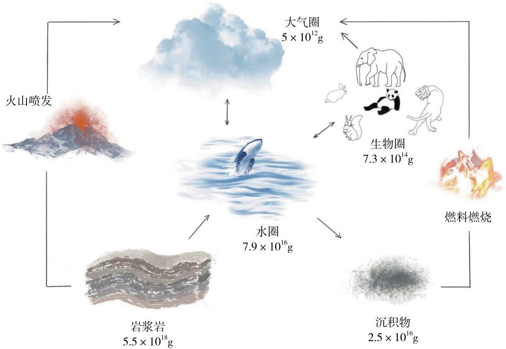 图6-1 碘在大气圈、水圈、地质圈和生物圈的循环过程及质量分布