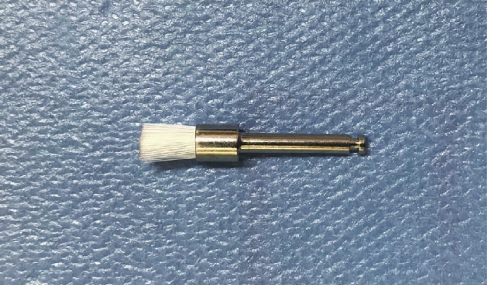 低速杯刷法是采用杯状毛刷蘸取清洁剂(图2-4),使用慢速手机清洁牙面窝沟及点隙,这是临床上较为常用的牙面清洁方法。但体外研究表明,这一方法不能彻底去除窝沟底部的沉积物,尤其是深窄的窝沟,影响封闭的效能 [2] 。