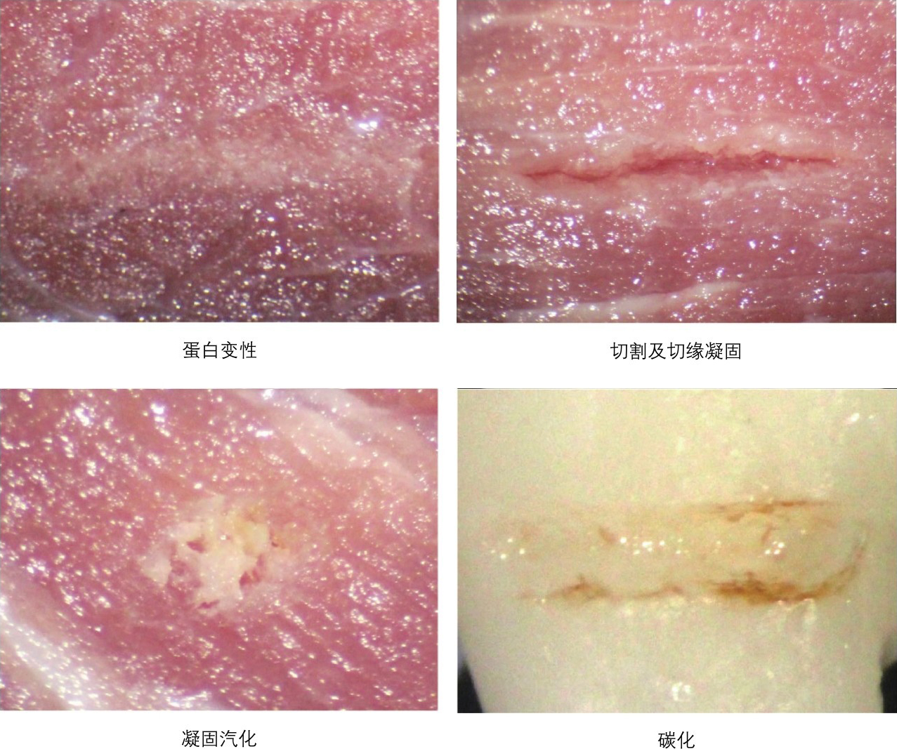 同其他所有光波一样,激光遇见物体时,可能出现4种情形:反射、散射、吸收和透射。其中物体对激光的吸收往往在激光的应用中发挥着巨大的作用,激光的波长则是组织对激光吸收率的决定性因素。当物体吸收激光时,会出现光热效应,即光能被转化为热能,应用于生物组织则可能起到凝固、汽化、切割等作用(图1-4)。