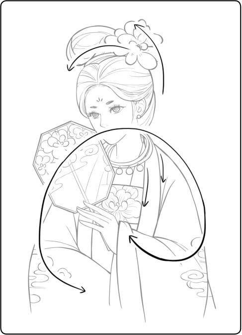 在半身像中,头部占比比较小,人物整体的线条走向布局比脸部的细节刻画更重要。古风人物的服装多是宽袍大袖,头发也都是长发,整个人物由长长短短的许多曲线所组成。有序地引导并利用这些曲线,是营造古风感的重点所在。