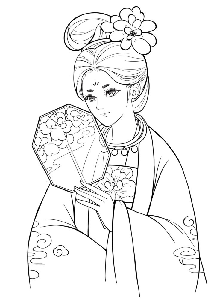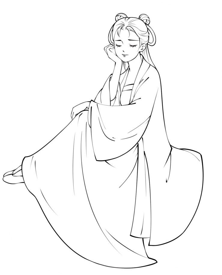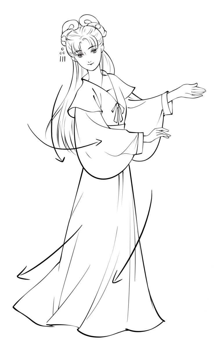 古风漫画人物的动态和表情设计也要有特点,举手投足要保持优雅唯美。长裙和大袖用长曲线描绘,表现流动感,有种温婉似水的气质。