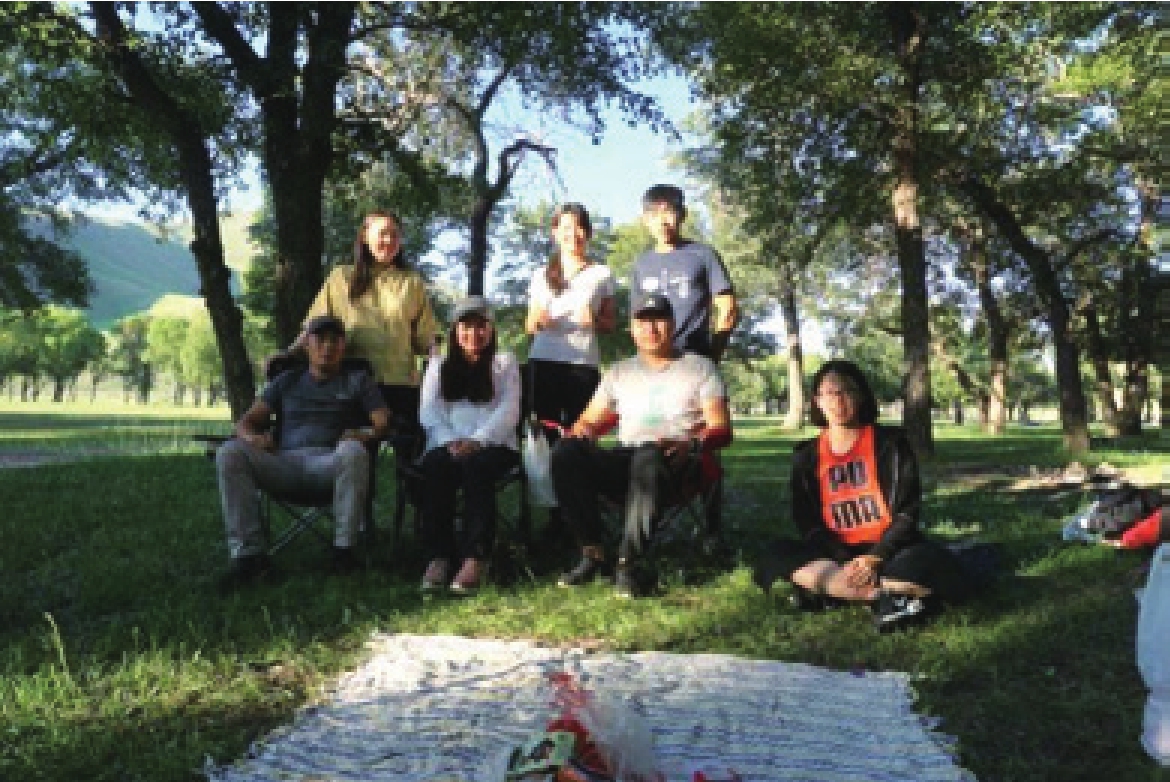 蒙古国人对待工作的态度和中国人有着很大的差异,在蒙古国没有加班,也没有996,员工准时上班,准时下班。一到周末或者节假日全家都会到城外草原露营中,没有信号,也不接受打扰。公司同事也会在周末带我们去玩(图4),自己动手做蒙古传统美食“石头烤肉”。所谓石头烤肉,就是用烧得滚烫的石头和肉一同放在锅里,再焖煮一个小时。烤肉用的石头一定是要选择在清冽的河水里泡了很久的圆润卵石,干石头一烧就容易裂开,尖石头受热会不均匀,圆润有韧劲的卵石可以和羊肉最大程度地贴合,让羊肉在焖煮的过程中还有一种焦香。一行七人,半只山羊,我们在寻找适宜野餐的地点时,也见到了许多其他全家出动的蒙古人,带上帐篷、烧烤架、泳衣和橡皮船,择水边树荫处支起帐篷和折叠椅,放一段音乐,享受美好的周末时光。