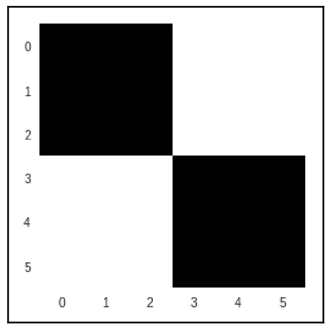 [[10, 10, 10, 0, 0, 0], [10, 10, 10, 0, 0, 0], [10, 10, 10, 0, 0, 0], [0, 0, 0, 10, 10, 10], [0, 0, 0, 10, 10, 10], [0, 0, 0, 10, 10, 10]]