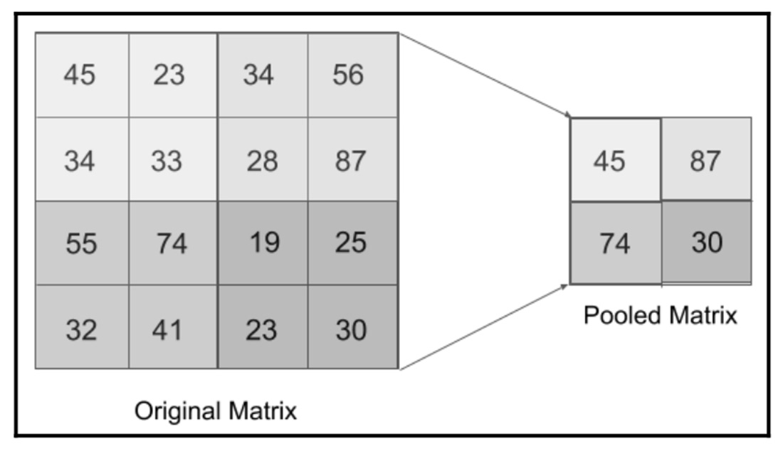 简单来说,池化就是将多个图像像素合并为一个像素的方法。图1-3中使用的池化方法称为最大池化(max pooling),其中仅将所选滑动窗口内核中的最大值保留在结果矩阵中。这极大地简化了图像,并有助于训练通用的滤波器,而不是单个图像独有的滤波器。
