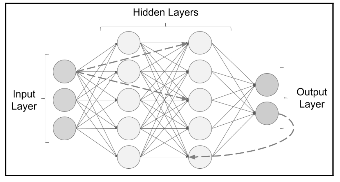循环神经网络(recurrent neural network,RNN)就是这样的架构。这种网络的主要特点是:它不仅以顺序方式将数据从一层传递到另一层,而且还将从任何上一层获取数据。在第1.2节“机器学习和深度学习”中介绍了一个带有两个隐藏层的简单人工神经网络(artificial neural network,ANN)的示意图(见图1-1)。在图1-1中可以看到,数据仅由上一层馈入下一层。但是,包含两个隐藏层的RNN则不像简单ANN那样强制要求仅由第一个隐藏层提供对第二个隐藏层的输入,在这里可以从任何上一层获取数据,如图1-5中的虚线箭头所示。
