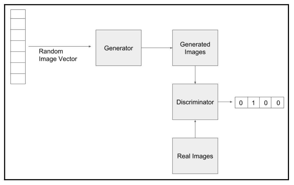 在这里,随机图像向量经过一个生成过程以产生假图像,然后由已经用真实图像训练的鉴别器进行分类。具有较高分类置信度的假图像进一步被生成,而置信度较低的假图像则被丢弃。随着时间的推移,鉴别器将学会正确识别假图像,而生成器则在多次迭代之后能够伪造越来越以假乱真的图像。