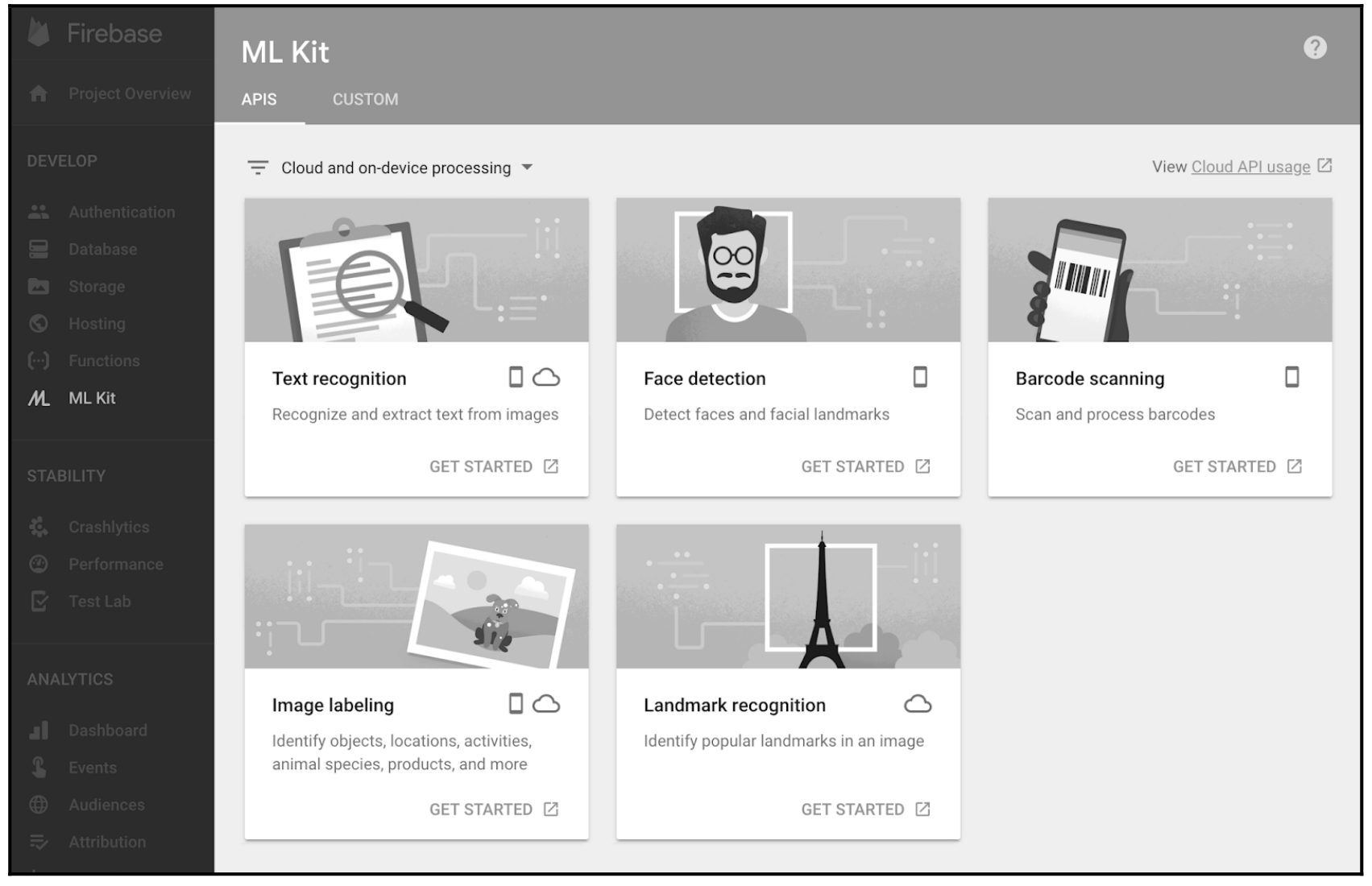 在图1-6中,可以看到Firebase ML Kit提供的API,包括Text recognition(文本识别)、Face detection(人脸检测)、Barcode scanning(条形码扫描)、Image labeling(图像标记)和Landmark recognition(地标特征识别)等。